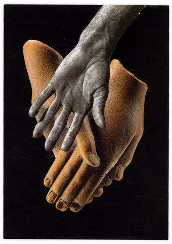 rgba(255,255,255,1) Henri FoucaultDouble jeu, Zwei Hände - 2025Collage papier sur carte postale Zwei HändeÄgyptisches Museumnan.14.5 x 10.5 cm© Henri Foucault Studio Demande d'information