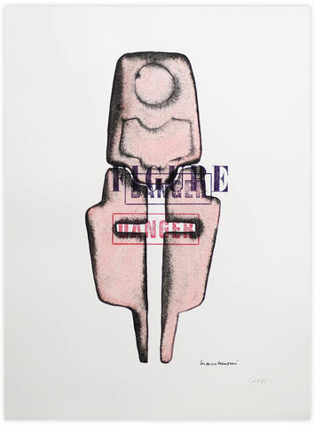 Aquarelle et encre de Chine, plume et lavis avec tamponnage triple FIGURE et double DANGER sur papier.