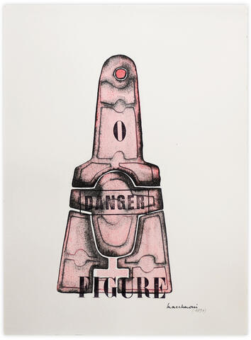 Aquarelle et encre de Chine, plume et lavis avec tamponnage O, FIGURE et DANGER sur papier.