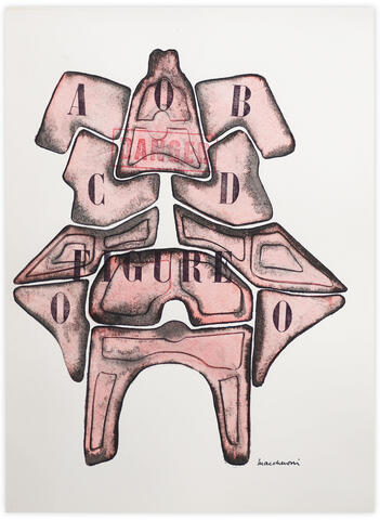 Aquarelle et encre de Chine, plume et lavis avec tamponnage de lettre, A, B, C, D, O et de FIGURE et DANGER sur papier.