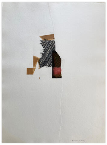 Aquarelle, encre de Chine, plume et lavis, avec arrachage bande kraft, frottage, hachure de crayon gras et déchirage sur papier contrecollé.