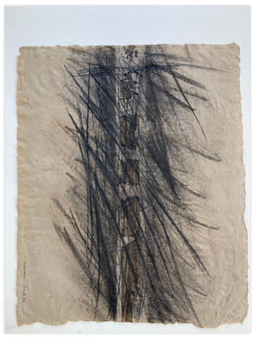 Techniques mixtes (crayons gras, fusain, collage, arrachage de bandes kraft, incise) sur papier lin Duchêne.