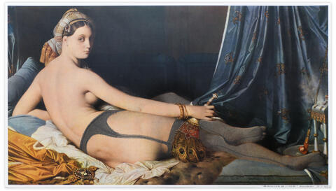 Dessin au crayon (porte-jarretelle) sur une affiche de la grande Odalisque d’Ingres.
