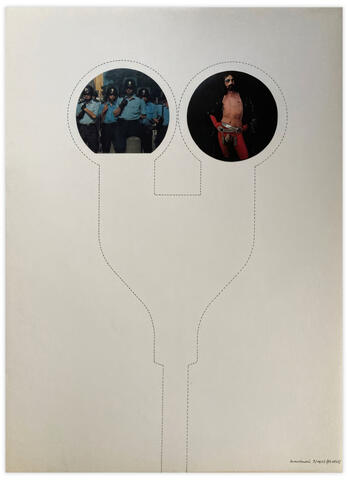 Collage image couleur de magasine avec découpe en reprint de l’horodateur sur feuille d’Arches.