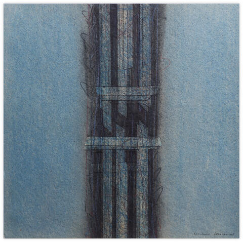 Peinture, gesso, crayon gras, graphite, hachure et collage de bandes papier) sur carton sable, contrecollée sur carton industriel sable.