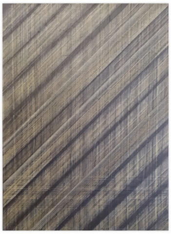 Peinture en techniques mixtes (gesso, crayon gras, sanguine, graphite, hachure et collage de bandes papier) sur carton blanc.