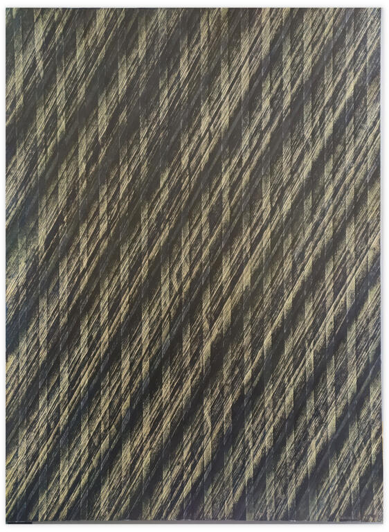Peinture en techniques mixtes (gesso, crayon gras, sanguine, graphite, hachure et collage de bandes papier) sur papier fort.