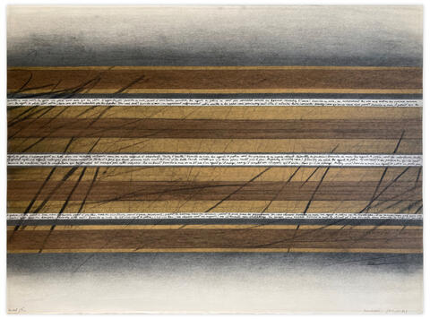 Texte manuscrit à l’encre de Michel Butor dans une peinture en techniques mixtes (gesso, crayon gras, graphite, hachure et collage de bandes de papier manuscrit et kraft) sur carton sable.