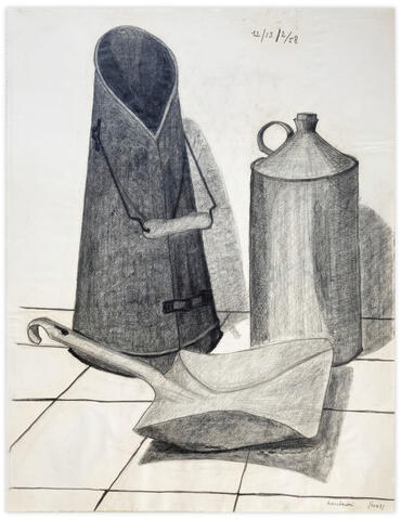 Dessin, étude de pichets et balayette, fusain et crayon gras sur papier Ingres fin.