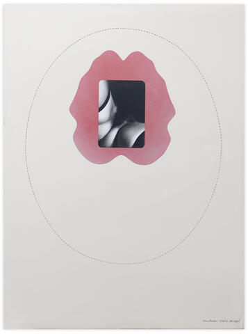 Collage en technique mixtes, avec reprint en pointillé d’une photo vintage des « 2000 photos du sexe d’une femme » et découpe en méat, acrylique et peinture