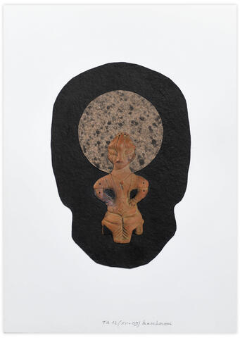Collage en techniques mixtes (découpe, encrée Chine, gesso et image cartonnée couleur) sur papier fort.