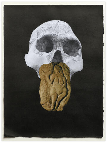 Collage en techniques mixtes (découpe, encre de Chine, photo et image cartonnée couleur) sur papier fort.