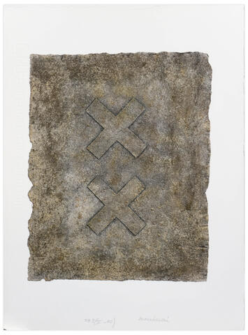 Peinture en techniques mixtes (découpe de croix, ocres du Roussillon, sable, gesso sur papier chargé en lin) contrecollé sur papier fort.