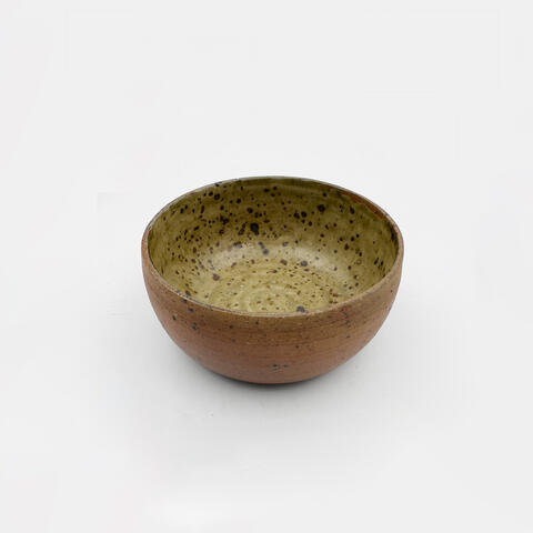 Grès légèrement pyrité naturel à l'extérieur et émail à la cendre à l'intérieur.