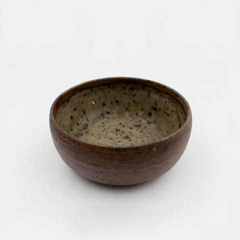 Grès légèrement pyrité naturel à l'extérieur et émail à la cendre à l'intérieur.