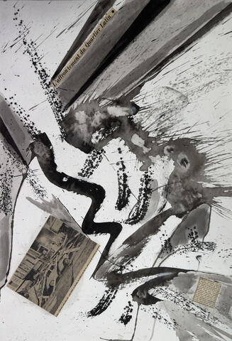 rgba(255,255,255,1) Jean-Jacques LebelBarrage - circa 1970Grand lavis d'encre et collage de coupures de presse sur papier, 51 x 73 cm.© Jean-Jacques Lebel, artiste Demande d'information