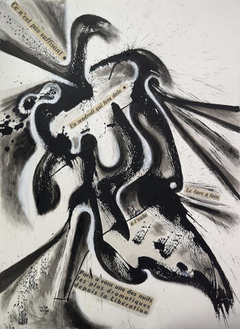 rgba(255,255,255,1) Jean-Jacques LebelCe n'est pas suffisant - circa 1970Grand lavis et collage de titres de presse sur papier, 76 x 56,5 cm.© Jean-Jacques Lebel, artiste Demande d'information