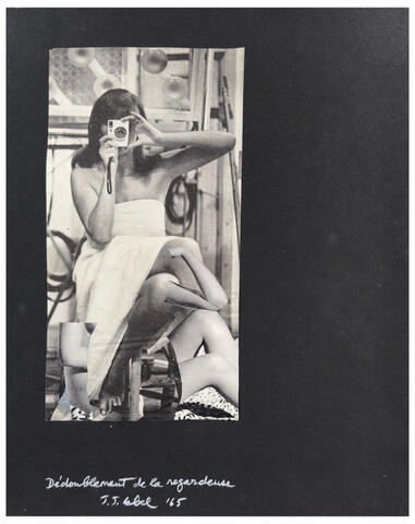 Oeuvre titrée "Dédoublement de la regardeuse" et, signée et datée "J.J. Lebel '65" en bas vers la gauche.
