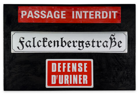 rgba(255,255,255,1) Jean-Jacques LebelFalckenbergstrasse Asemblage de panneaux de signalisation, 61 x 91,5.© Jean-Jacques Lebel, artiste Demande d'information