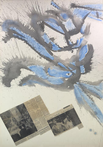 rgba(255,255,255,1) Jean-Jacques LebelJe suis un modérateur - circa 1970Grand lavis d'encre et collage de coupures de presse sur papier, 120 x 80 cm.© Jean-Jacques Lebel, artiste Demande d'information
