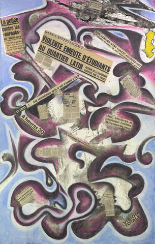 Grand lavis d'encre, peinture et collage de coupures de presse sur papier, 120 x 80 cm.