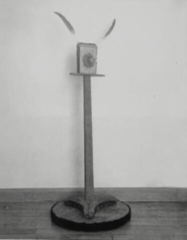 rgba(255,255,255,1) Jean-Jacques LebelLa Promesa del senor Caganer - 1991Sculpture en métal, bois, plume et cire, 200 x 130 x 130 cm.Jean-Jacques Lebel, artiste Demande d'information
