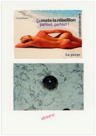 Ensemble composé d'une carte postale et d'une photographie de Jean-Jacques Lebel réalisée à Venise où un oiseau a faut son nid dans un trou en marbre. Ajout de textes découpés "Silence effrayant", "Ça mate la rébellion partout partout !", "Le pétrole touche une île", "La Purge". Tampon "VÉRIFIÉ".
