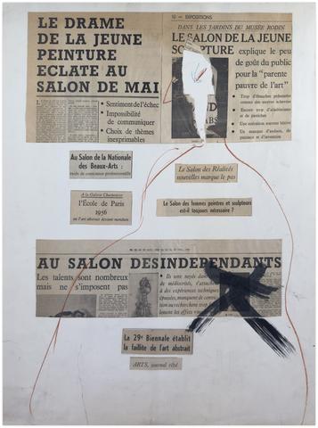 Dessin et coupures de presse sur papier, "LE DRAME DE LA JEUNE PEINTURE ECLATE AU SALON DE MAI", "LE SALON DE LA JEUNE SCULPTURE", AU SALON DES DESINDEPENDANTS", "Au Salon de la Nationale des Beaux-Arts, excès de conscience professionnelle", "A la Galerie Charpentier // L'École de Paris 1956 // ou l'art abstrait devient mondain", "Le Salon des Réalités // nouvelles marque le pas", "Le Salon des femmes peintres et sculpteurs // est-il toujours nécessaire ?", "La 29e Biennale établit // la faillite de l'art abstrait", "ARTS, journal rêvé".
