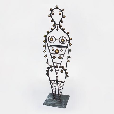 Sculpture en fer forgé complétée de clochette en bronze soudées ou bien attachées à une ceinture de cuir. Une poignée au verso permet de faire tinter les clochettes.