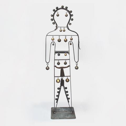 Sculpture en fer forgé complétée de clochette en bronze soudées ou bien attachées à une ceinture de cuir. Une poignée au verso permet de faire tinter les clochettes.