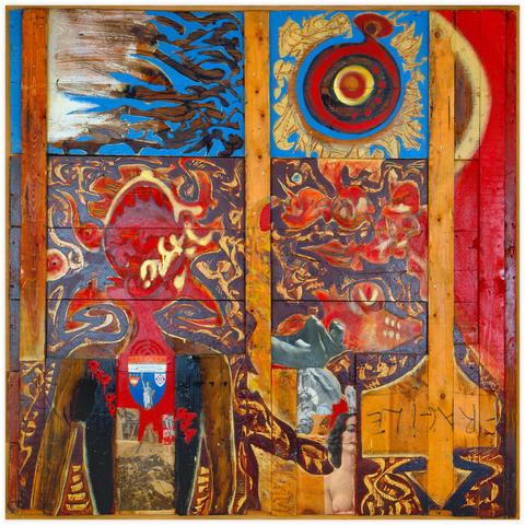 rgba(255,255,255,1) Jean-Jacques LebelParis / New York avec Johanna - 1961Peinture et collage sur contreplaqué.140 x 140 x 15 cm.© Jean-Jacques Lebel, artiste Demande d'information