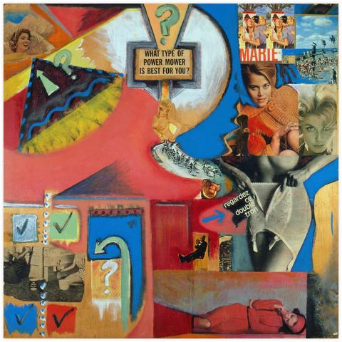 rgba(255,255,255,1) Jean-Jacques LebelTour de France avec Jane - 1962Collage et peinture.98,8 x 100 cm.Réalisé à Paris.© Jean-Jacques Lebel, artiste Demande d'information