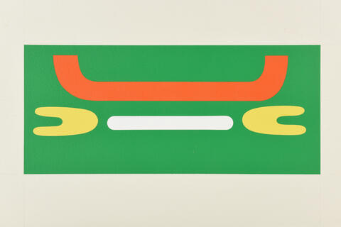 rgba(255,255,255,1) Jean LegrosPochoir sans titre aux signes rouge, jaunes, blancPochoir sur papier, cachet d'atelier, 57 x 76 cm, 1973.© Atelier Jean Legros Demande d'information