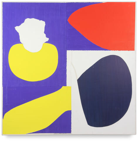 Papier gouaché découpé aux ciseaux et collés sur toile, 120 x 120 cm.