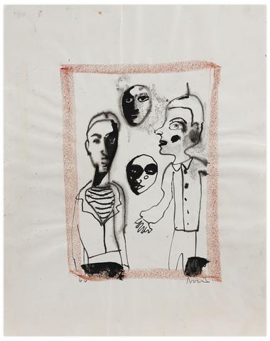 rgba(255,255,255,1) Norris EmbrySans titre (Deux hommes à mi-corp et deux masques), 1966Signé 'Norris' (en bas à droite), daté '66' (en bas à gauche) pastel gras et encre sur papier 34.3 x 27.1 cm.