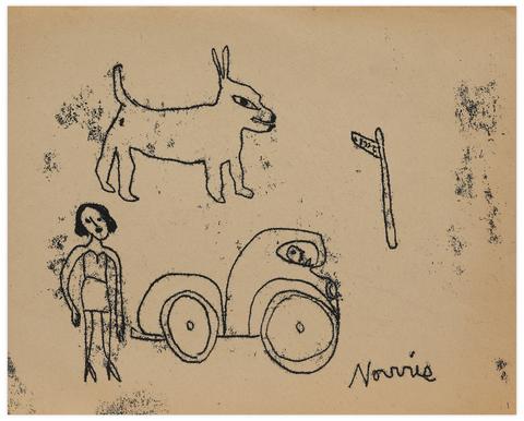 rgba(255,255,255,1) Norris EmbrySans titre (Femme, chien et voiture), vers 1955-1960Signé 'Norris' (en bas à droite) monotype sur papier chamois 22.5 x 29.8 cm.