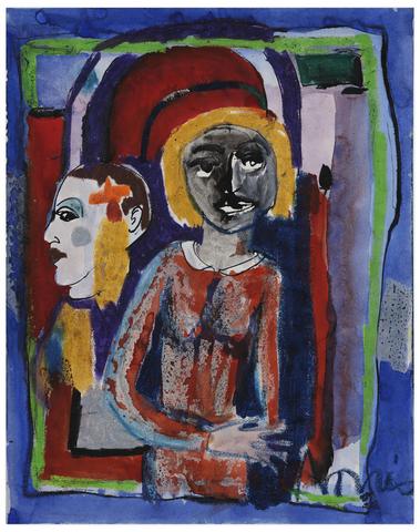 rgba(255,255,255,1) Norris EmbrySans titre (Femme en robe de face et homme de profil), vers 1965-66Signé 'Norris' (en bas à droite) aquarelle, gouache, pastel gras et encre sur papier 34.2 x 27.1 cm.
