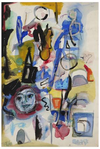 rgba(255,255,255,1) Norris EmbrySans titre (Masque bleu), 1966Signé 'EMBRY' (en bas à droite), daté '1966' (en bas à gauche) gouache, aquarelle et pastel gras sur papier 56 x 38 cm.