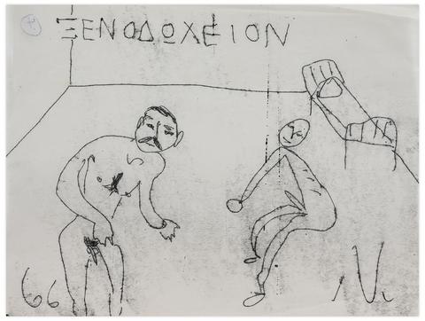 rgba(255,255,255,1) Norris EmbryXenodocheíon (Hotel, deux hommes nu et un lit), 1966Signé de l'initiale 'N' (en bas à droite), daté '66' (en bas à gauche); titré 'ΞΕΝΟΔΟΧΕΊΩΝ' (en haut) monotype sur papier fin 21.4 x 27.8 cm.