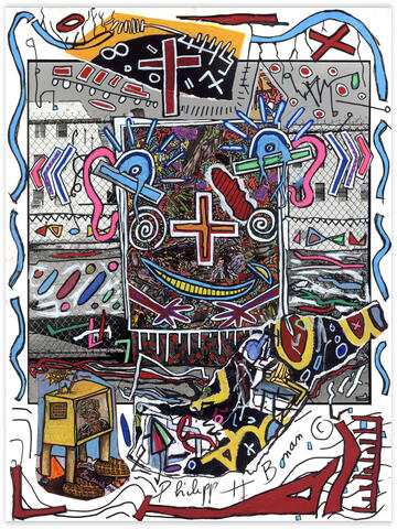 rgba(255,255,255,1) Philipp Hugues BonanSans titre (8+7)Collage et peinture sur photo en hommage à Robert Combas, 40 x 30 cm. Demande d'information