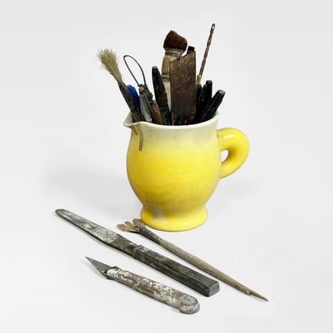 Faïence, émail jaune brillant dégradé blanc. Les outils du sculpteur-céramiste.
