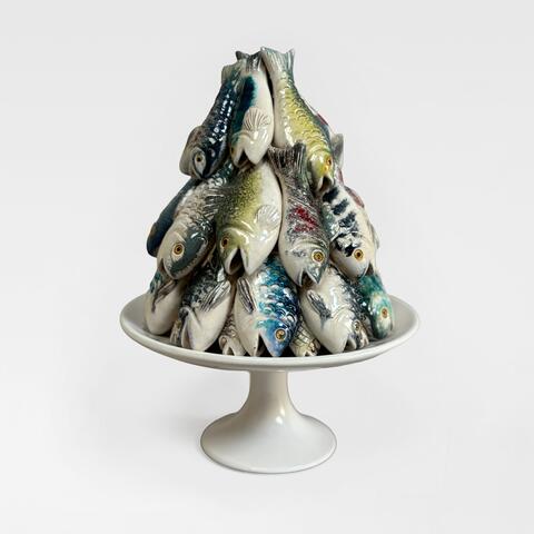 Faïence émaux bleu, rouge, jaune, gris sur base blanc laiteux brillant.