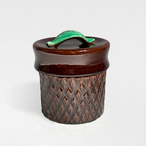 Faïence émail brun brillant et anse en feuille vert tendre.