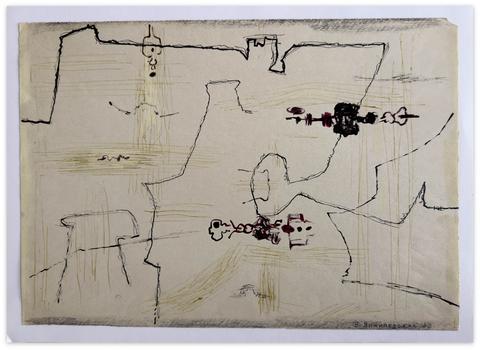rgba(255,255,255,1) Vladimir YankilevskyTheme and Improvisation, 1962Indian ink and pastel on paper, 30.3 × 41.5 cm.© Vladimir Yankilevsky