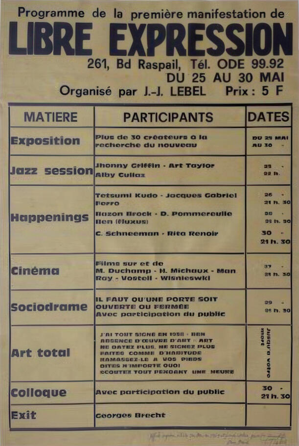 Le workshop de l'expression libre fonctionnera de manière à la fois permanente et dynamique du Lundi 25 Mai à 15 heures au Samedi 31 Mai 1964 à minuit. Tous les soirs à 21 heures, il y sera présenté des happenings, des sociodrames (c'est-à-dire des séances de poésie directe et des spectacles audiovisuels), du théâtre éclaté, des projections de films, une séance de jazz, des débats publics et divers autres manifestations auxquelles vous êtes invité à prendre part. Ces manifestations se derouleront dans le cadre d'une exposition internationale ou figureront les artistes suivants:
