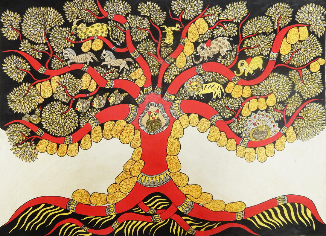 L’art vernaculaire indien regroupe des styles de peinture enracinés dans des pratiques locales et spirituelles. Ces œuvres, autrefois réalisées sur les sols ou les murs des maisons, servaient à conjurer le mauvais sort ou invoquer des moments heureux.