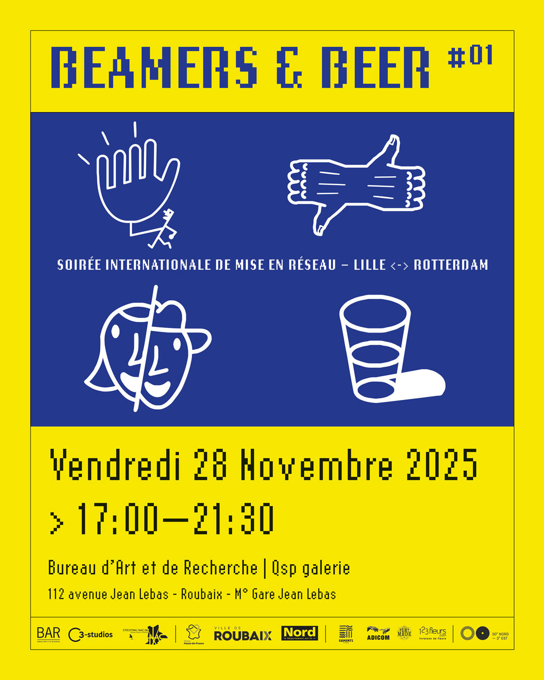Dans le cadre de TEE, le Bureau d’Art et de Recherche (Roubaix) et C3-studios (Rotterdam) ont le plaisir de vous convier à la première soirée internationale de mise en réseau BEAMERS & BEER #01*
