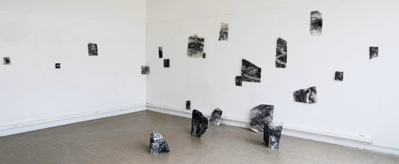 L’exposition se construit autour d’un ensemble de pièces où plâtre, peinture acrylique et images imprimées coexistent dans un régime discret de couches et de dépôts. Les surfaces ne cherchent pas l’effet mais l’activité lente de la matière : elles accueillent le retrait, l’effacement, la fissure, la reprise. Par le jeu du noir et du blanc, Jingyuan Chen ne reconduit pas la rhétorique classique de l’opposition binaire ; il installe plutôt une gradation continue où le sombre et le clair deviennent des opérateurs de lecture, presque des outils analytiques. Le noir n’est pas ici valeur dramatique ; il agit comme champ d’inscription et de retenue, tandis que le blanc fonctionne comme réserve, intervalle, ou suspension du visible.
