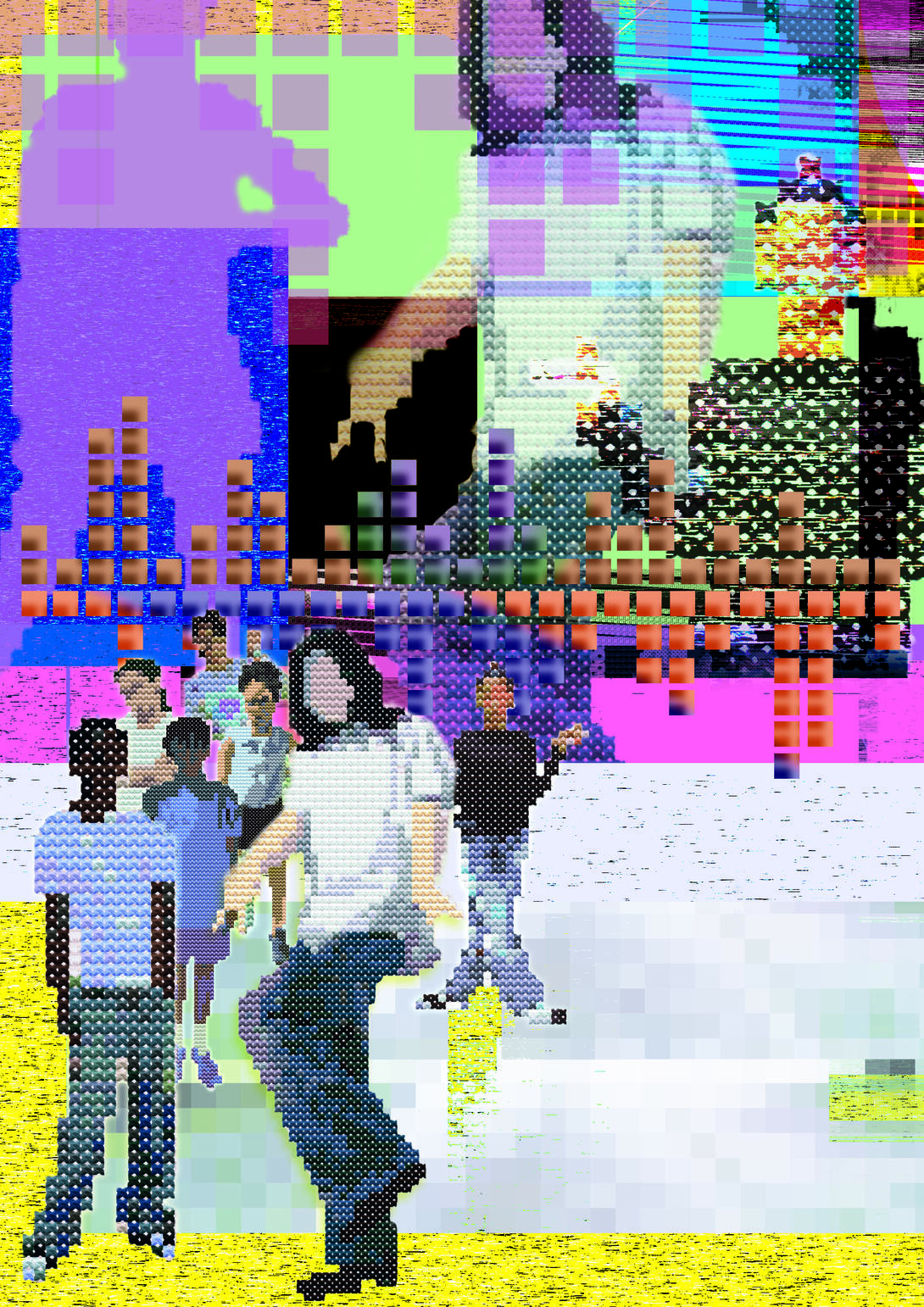 Revenir au pixel. À l’irréductible que l’on a toustes en commun. Des milliers de petites briques élémentaires pour broder l’autoportrait d’une jeunesse plurielle. Des silhouettes attachées à leurs smartphones nous guident dans un espace recomposé où l’intimité d’un lit-cabane cohabite avec la sociabilité d’une chaise de camping. Le flow et la forêt. Un vocabulaire qui emprunte ses motifs ici et ailleurs, qui puise dans ces gestes dont on se souvient peut-être. Avec le fil, l’aiguille et le son, les chemins se rapprochent mais ne se croisent pas forcément. Une cartographie sonore et brodée par écrans interposés.