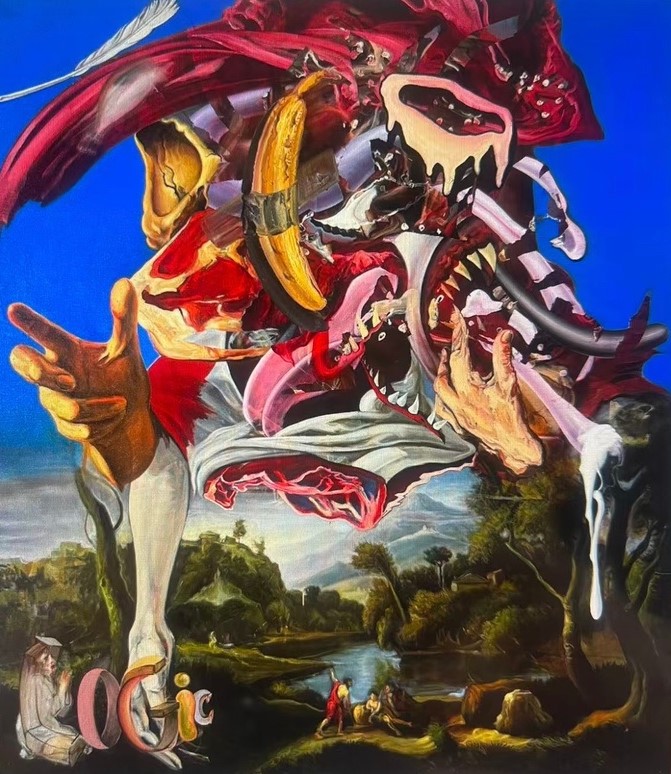 Les scènes représentées fonctionnent comme des espaces mentaux, où mythologie, religion, culture populaire et références contemporaines se rencontrent sans hiérarchie stable. Cette coexistence produit un champ d’interprétation ouvert, où l’image demeure fondamentalement équivoque.